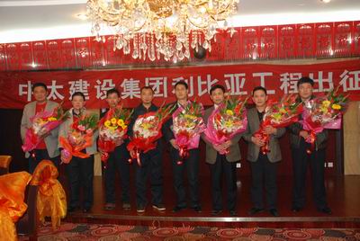 儀式上,張總對五公司成功進軍利比亞建筑市場表示祝賀,他們的一舉一動、一言一行,不僅代表著中太,代表著河北和廊坊,更代表著中國企業的形象。希望他們在海外施工中充分展示中太人的精神風貌,積累經驗,打造精品工程,為集團公司未來拓展海外市場打下良好的基礎,集團李主席和全體員工期待著他們勝利凱旋。
