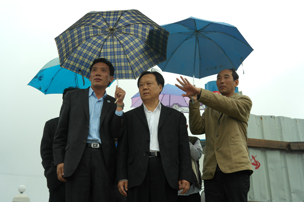 董事局主席李文健(中)在安徽分公司總經理陳德剛(左)的陪同下,冒雨視察項目工地