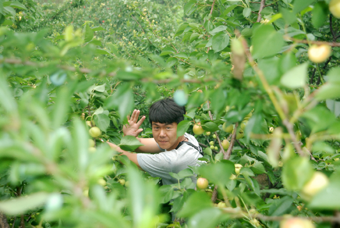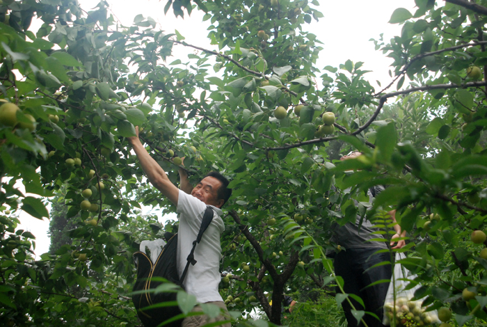 盡管空氣潮濕,路面濕滑,但阻擋不了大家采摘的熱情。面對著綴滿枝頭的杏兒,大家早就沒有平日里的文雅和羞澀,翹腳、彎枝,瞄準(zhǔn)了那大個(gè)地、泛著紅暈的京白杏兒,熟練地采摘。